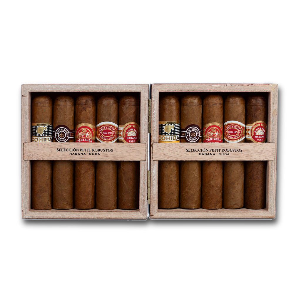 The fantastic selection contains 10 Petit Robusto Cigars from Habanos S.A's most prestigious brands, which is particularly enticing to those that would enjoy the opportunity to taste a variety of brands in this specific format.